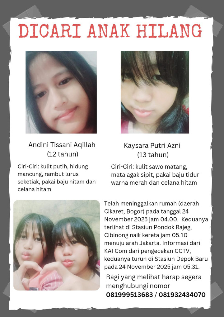 Kaysara Putri Azni (13 tahun) dan Andini Tissani Aqilla (12 tahun), saudara kandung dari Cibinong, Bogor, Jawa Barat, menghilang saat sedang membeli sabun di toko dekat rumah mereka, Senin (24/11).