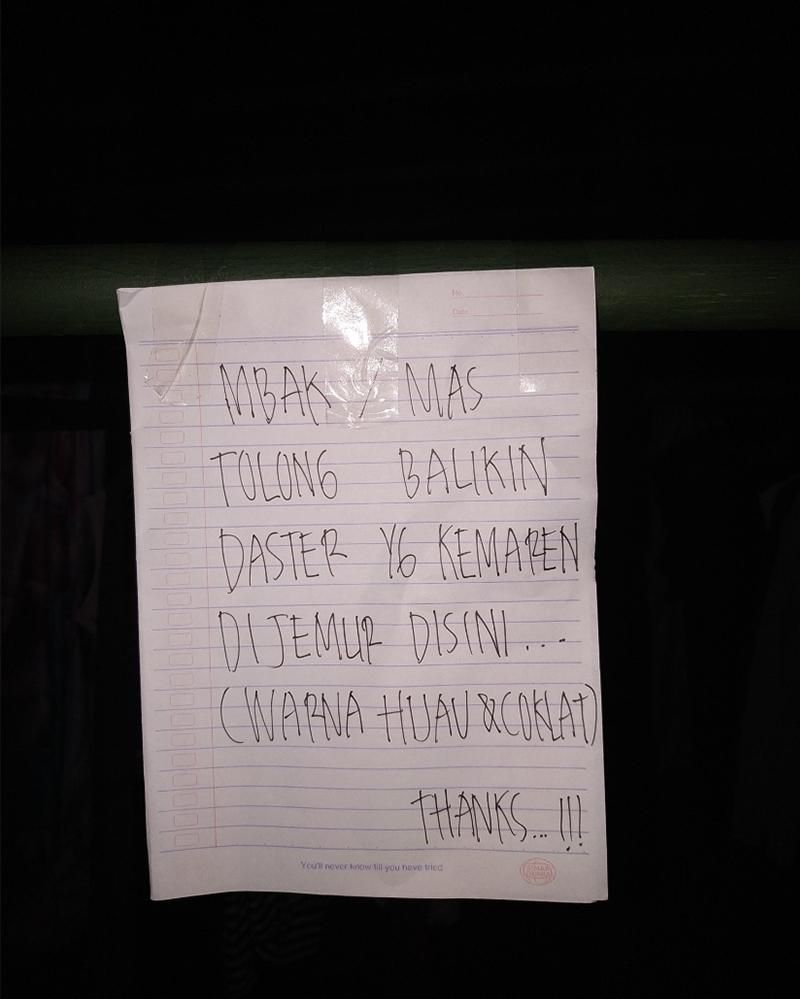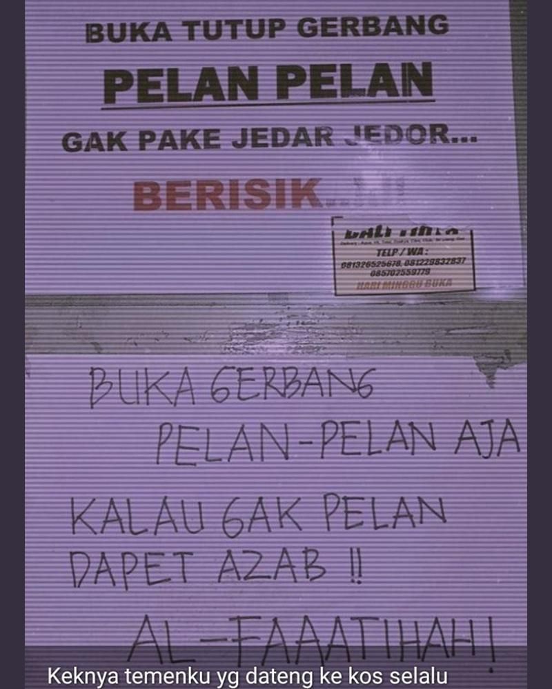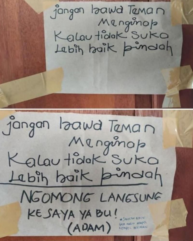 Pemilik kontrakan bahkan menulis peringatan dengan jelas mengenai hal tersebut. Tidak terima, salah satu anak kontrakan bernama Adam membalas pesan ibu kontrakannya di kertas yang sama.