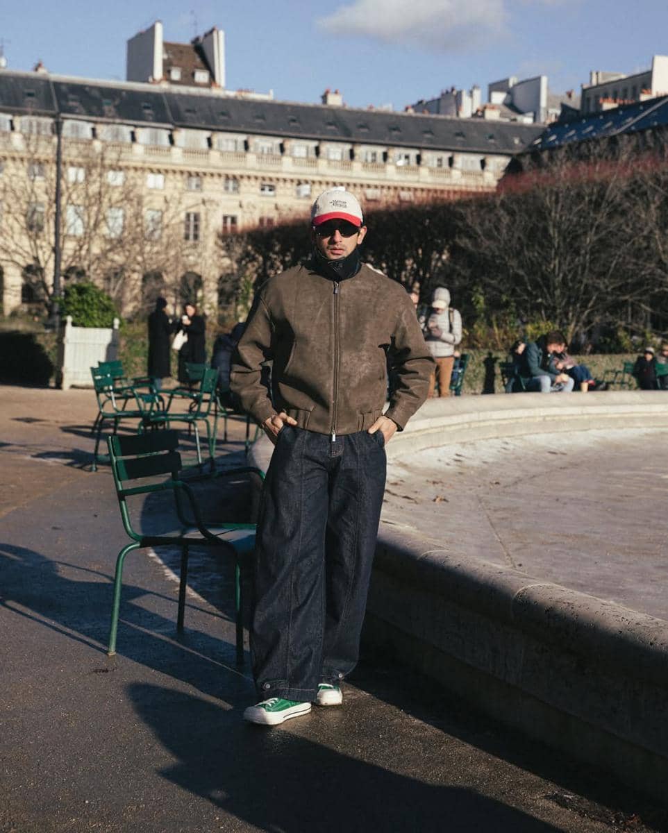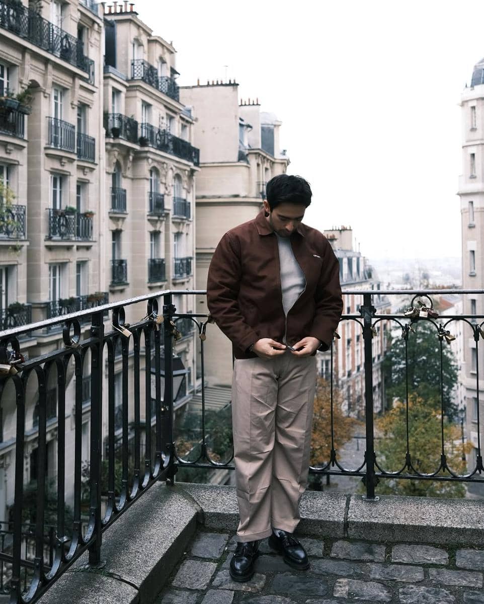 3. Gaya kasual saat berada di luar negeri dengan jaket cokelat berzip, kaus abu-abu, dan celana longgar yang menciptakan kesan santai dan tidak terlalu memikirkan penampilan