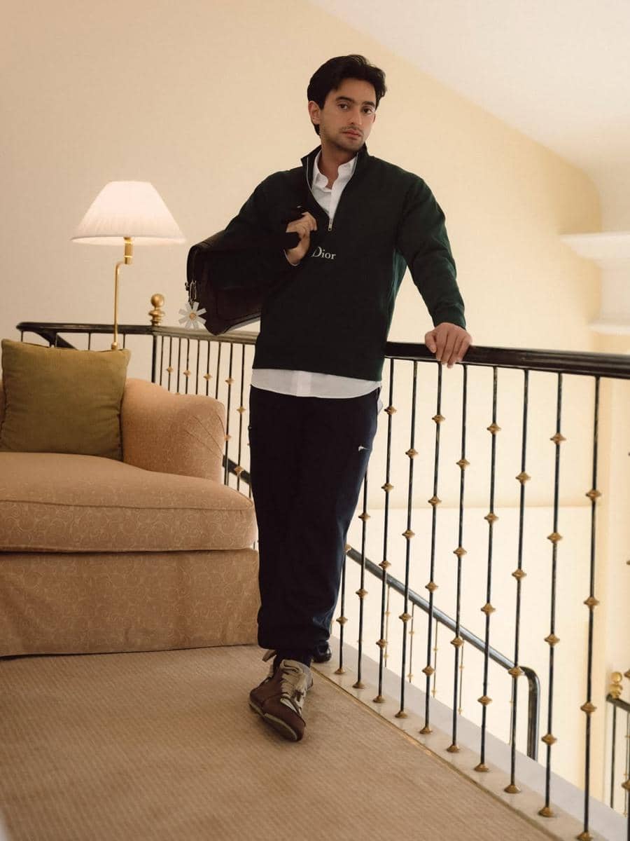 6. Kombinasi kemeja berwarna putih dengan jaket half-zip berwarna hijau tua menciptakan kesan rapi tetapi tetap dinamis dan nyaman.