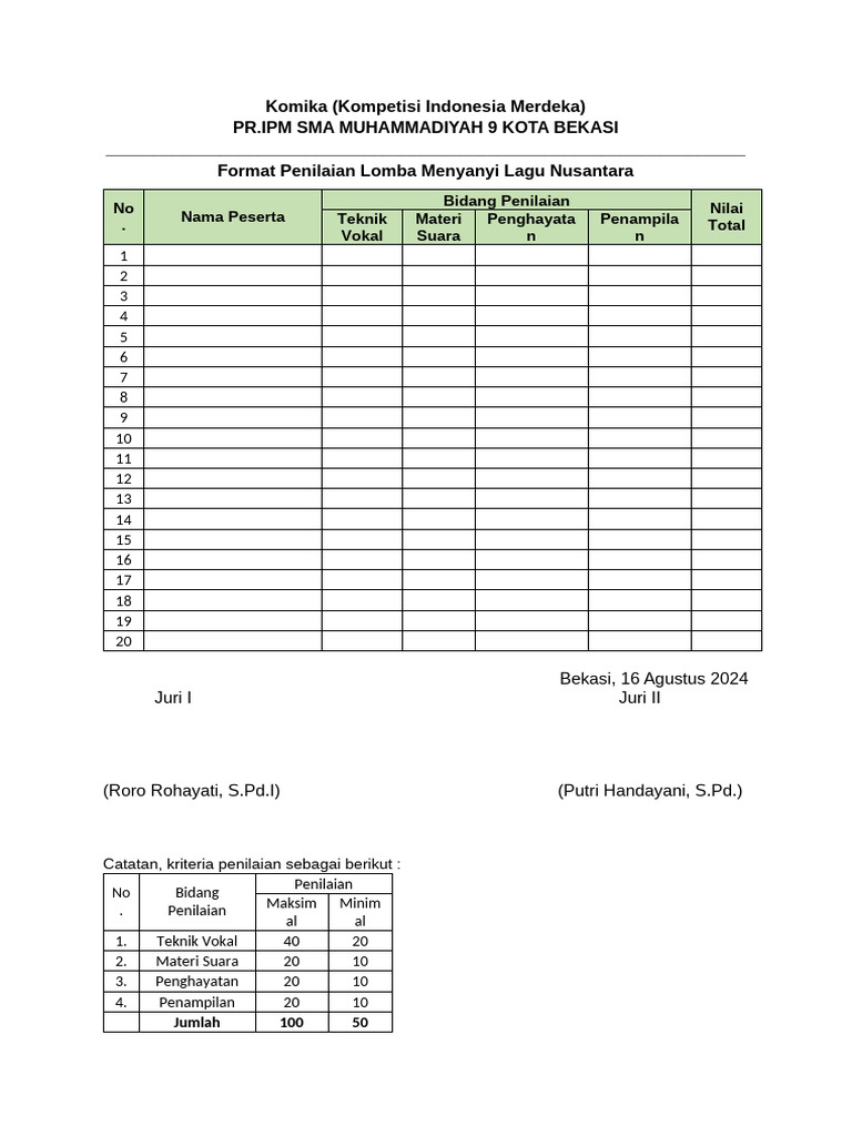 Pelaksanaan setiap cabang lomba dilakukan dengan memprioritaskan prinsip objektivitas, transparansi, dan akuntabilitas. Juri yang terlibat adalah para profesional yang memiliki keahlian di bidang seni masing-masing, sehingga proses penilaian berjalan secara dapat dipercaya.
