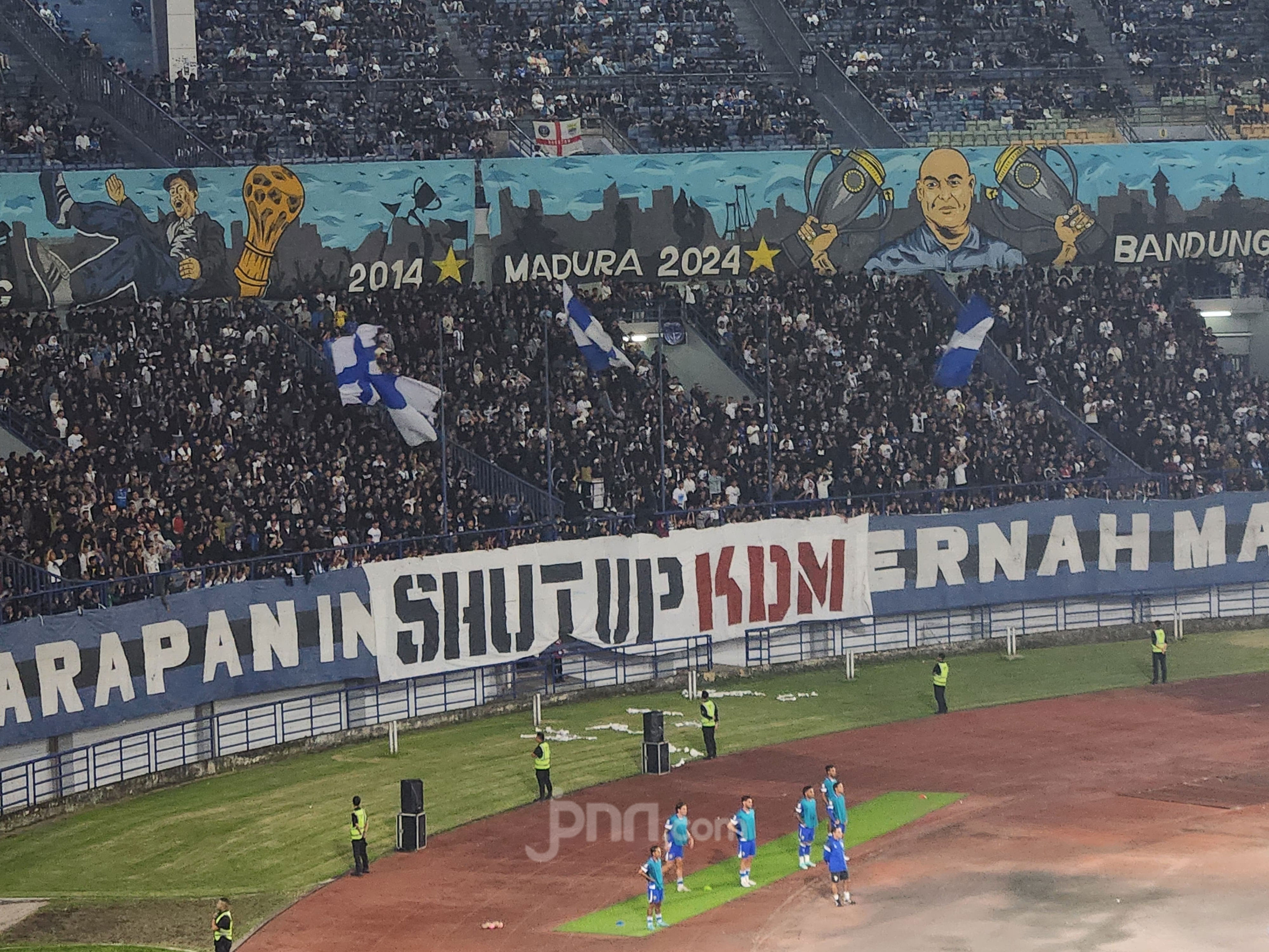 - BANDUNG - Pertandingan Persib Bandungvs Arema FC dalam pertandingan pekan ke-29 BRI Super League 2025/2026 di Stadion Gelora Bandung Lautan Api (GBLA) diwarnai dengan pemasangan spanduk yang ditujukan kepada Gubernur Jawa Barat Dedi Mulyadi.